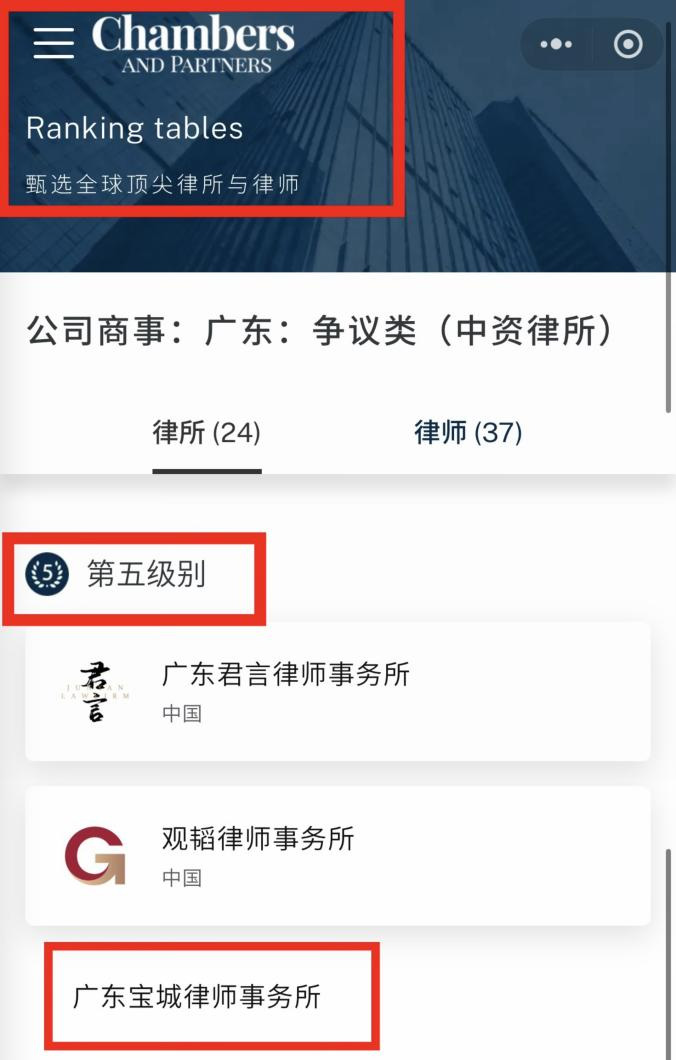 2026年1月15日,国际权威法律评级机构钱伯斯(Chambers and Partners)发布了《2026钱伯斯大中华区法律指南》,凭借在争议解决领域的卓越表现与优质的市场口碑,广东宝城律师事务所首次荣登该榜单钱伯斯榜单公司商事-广东-诉讼Band5。